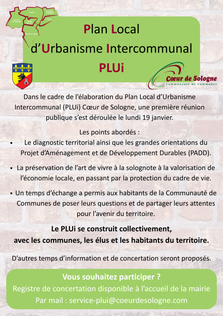 La communauté de commune Coeur de Sologne organise une réunion publique concernant le PLUi (Plan Local d’Urbanisme Intercommunal) : 📅…