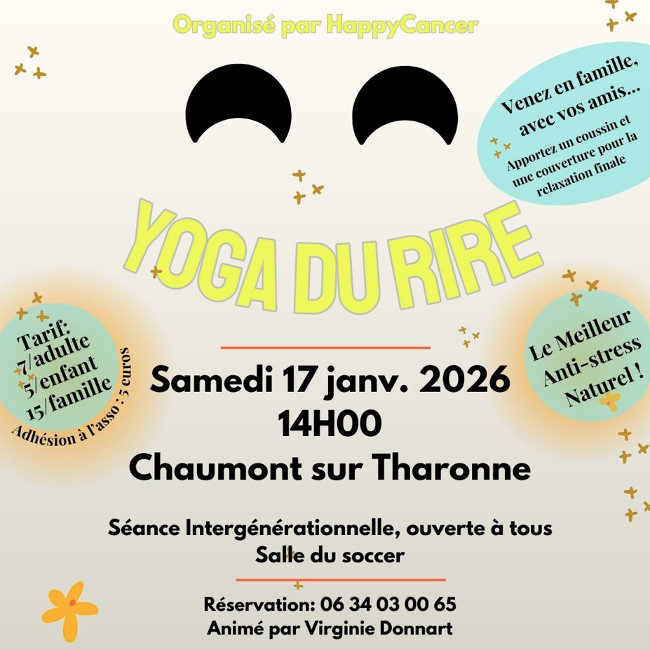 Venez vivre un moment de joie et de bonne humeur lors d’une séance de yoga du rire, organisé par l’association Happy Cancer, le samedi 17 janvier à 14h00 à la salle multi-activités.