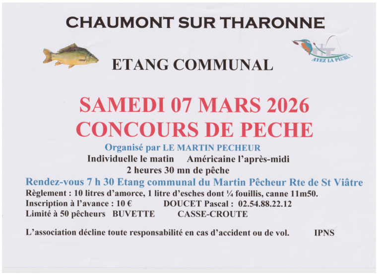 đConcours de pĂȘcheđ 7 mars 2026 Ă 7 h 30 min Agenda L’association du Martin pĂȘcheur vous propose son concours de pĂȘche : đ Samedi 07 mars đ7h30 đEtang du Martin PĂȘcheur – rue de Tremblevif âč Inscriptions et informations : 02.54.88.22.12