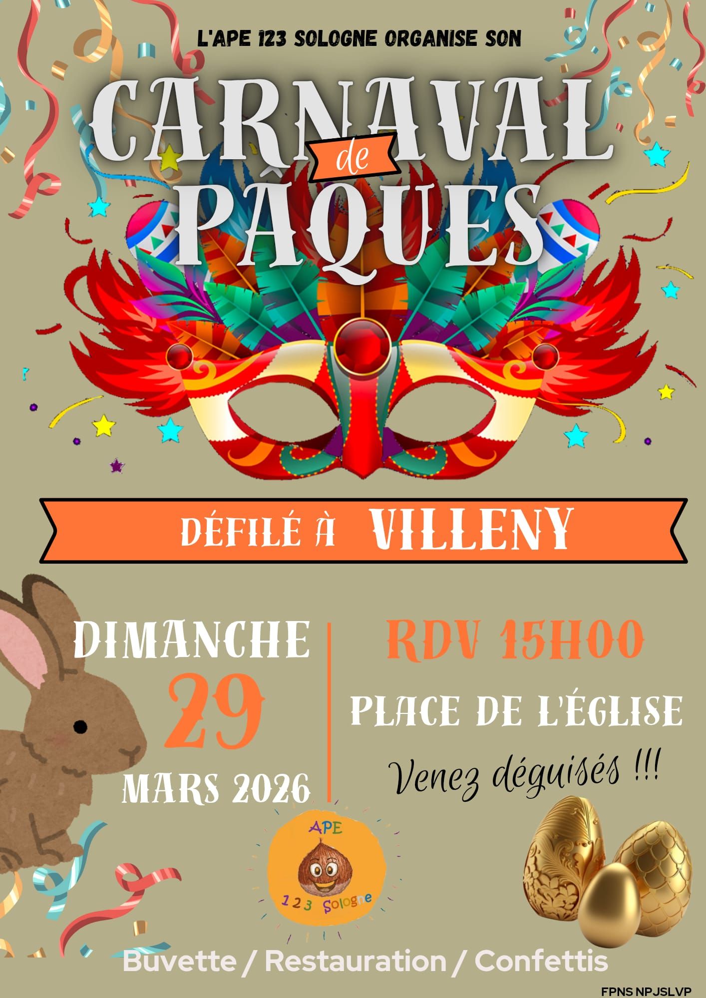 📌Carnaval🥳 29 mars 2026 Ă 15 h 00 min Agenda L’ APE 1 2 3 Sologne organise le carnaval de Pâques ! đź“…Dimanche 29 mars đź•’15h00 📍Villeny, Place de l’Ă©glise