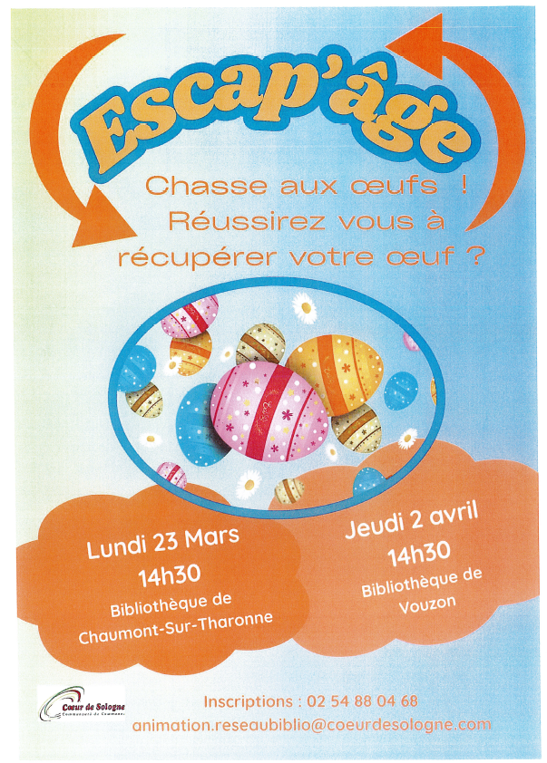 📌Escap’âge🔍 23 mars 2026 Ă 14 h 30 min Agenda Il n’y a pas d’âge pour s’amuser ! La bibliothèque intercommunale vous propose une animation le : đź“… Lundi 23 mars đź•’ 14h30 📍Bibliothèque, rue de Vouzon đź–ŠInscriptions 02.54.88.04.68 ou animation.reseaubiblio@coeurdesologne.com